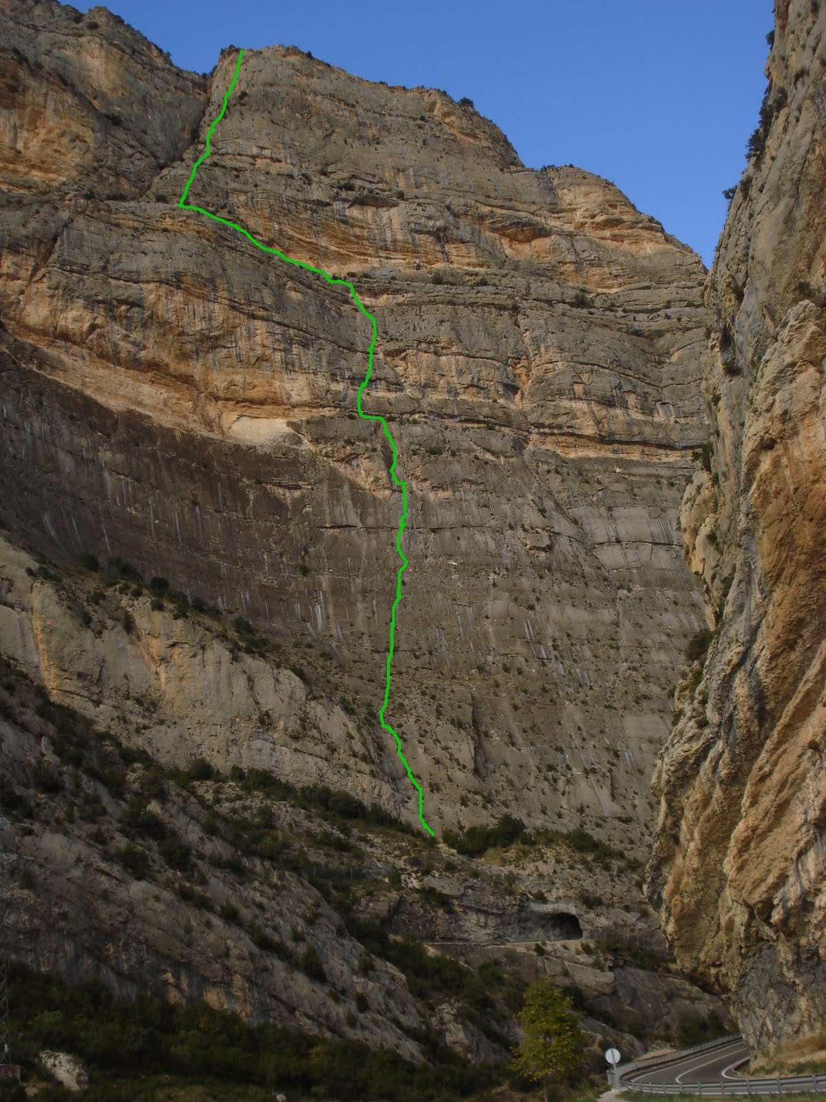 Este dissabte abandonem l’escalada-relax i anem a una paret de veritat, com és la paret de les Bagasses, al congost de Terradets. Triem la via Vidal-Farreny 6a/Ae (V+ obligat) 470 m. És una clàssica, oberta el 12 de Gener de 1974. Aparquem al parking de la font de les Bagasses i amunt. La roca és bona i l’equipament variable. Podem trobar des de moderns parabolts, claus, fins a cordinos de fa molts anys. Cal agafar també tascons, friends i un estrep. Anem encadenant llargs a bon ritme, encara que en el tram d’artificial algú pateix més del compte. Anem veient altres cordades a les vies veïnes. Arribem a la feixa superior i veient que ja era tard, anem baixant cap a la carrretera. Parem a fer la cerveseta de rigor i cap a casa falta gent.