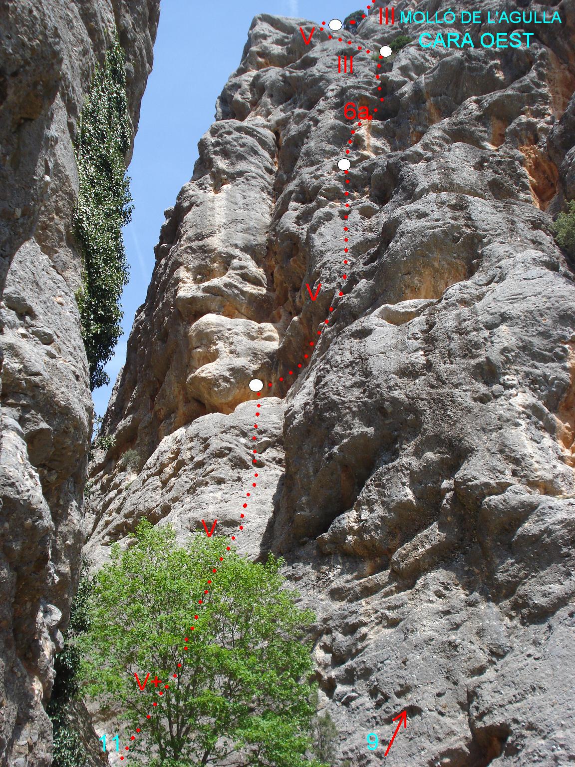 Poc a poc els Mollons es van omplint de vies d’escalada i cada cop queden menys línies lògiques que resseguir. La radera és aquesta via Llorda, que, com el nom indica, no és la més agraciada del sector. Es situa a la part esquerra de la paret oest del Molló de l’Agulla i puja sinuosament intentant evitar panxes, allí on no ho aconsegueix els passos es tornen molt obligats.