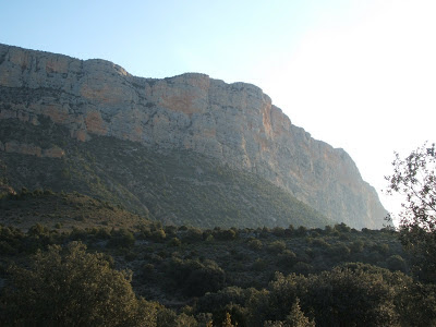 Aquest cap de semana ens hem desplaçat a la Franja per escalar a la mal anomenada paret d’Aragó del Montsec d’Estall. El dissabte ens hi fiquem l’Albert, Francesc i Joan a la via Cistus Albidus (470 m 6è), una bona clàssica de bona roca i poc equipament que va guanyant interés a mesura s’enfila. Destaquen els darrers llargs que superen un gran sostre de forma intel.ligent. El diumenge hi tornem la Mari Pau, Toni i Joan i fem la gran clàssica Santiago Domingo (410 m V+).Via més discontínua que té en el diedre del 8è llarg el pas clau del recorregut i com a més curiosos i bonic els darrers metres de la fumera final.